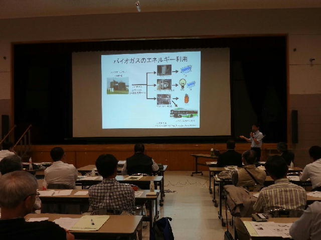 小林さんの講演に続き、大学酪農学科32期卒業の中山博敬さん(国立研究開発法人土木研究所寒地土木研究所)によるバイオガスプラントの技術解説が行われました。中山さんからは、バイオガスを用いた発電電力は再生可能エネルギーの一つであること、発電時に発生する熱エネルギー利用の課題などについてお話しいただきました(写真3)。